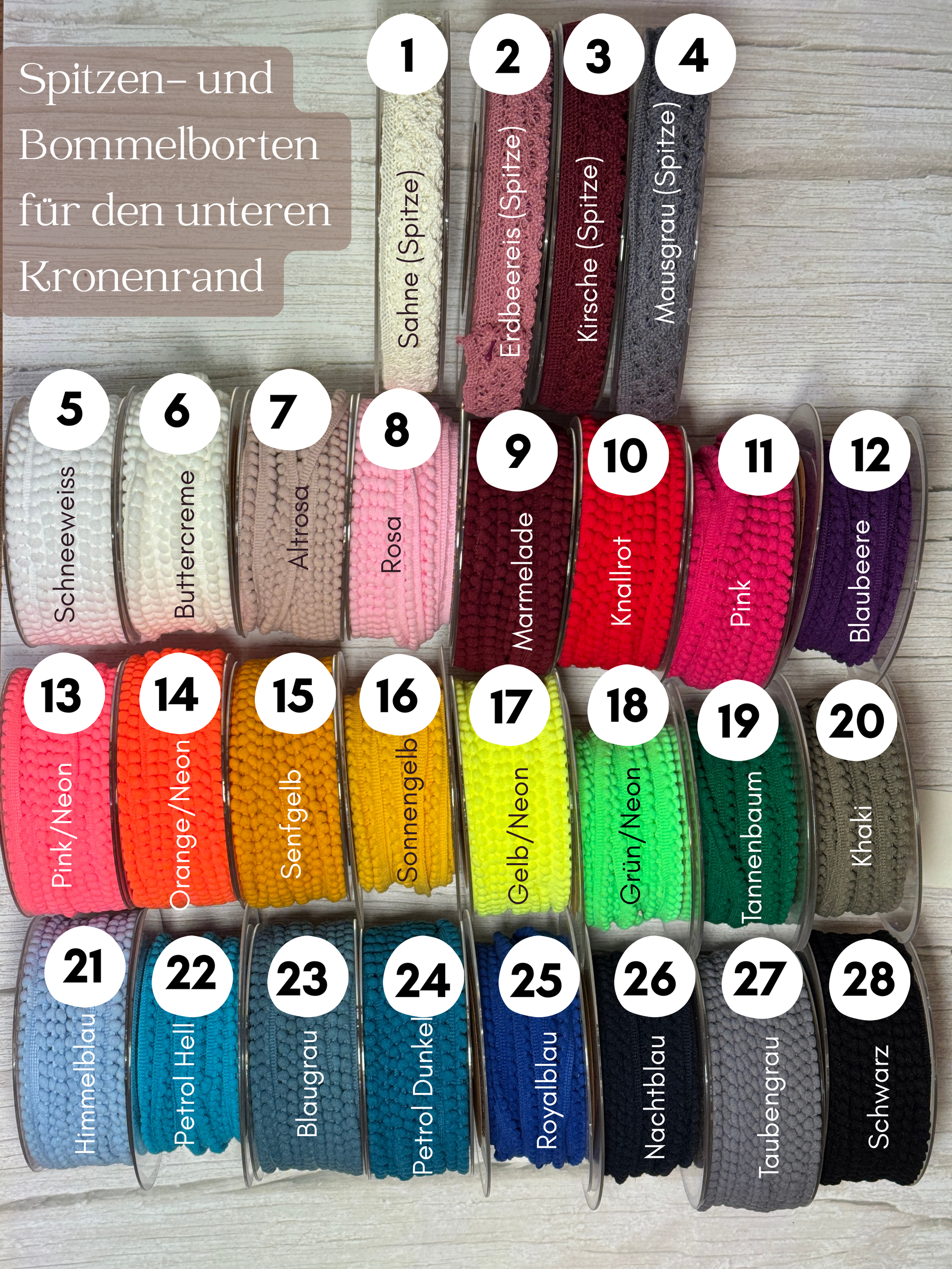 - Farblich Abgestimmt: Stimmen Sie die Farben der Bommel und der dekorativen Bommelborte am Abschluss perfekt auf Ihr Wunschdesign ab.